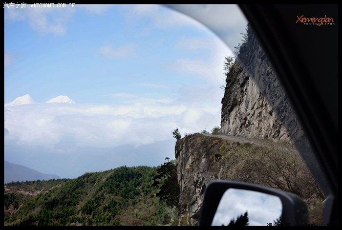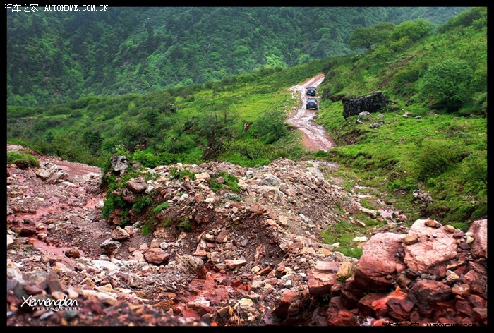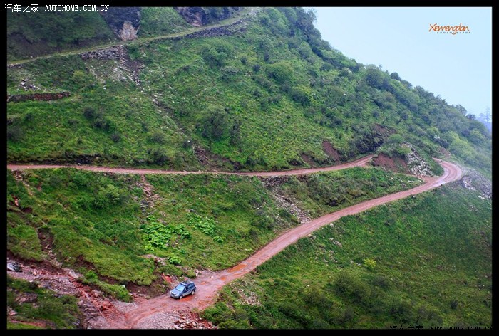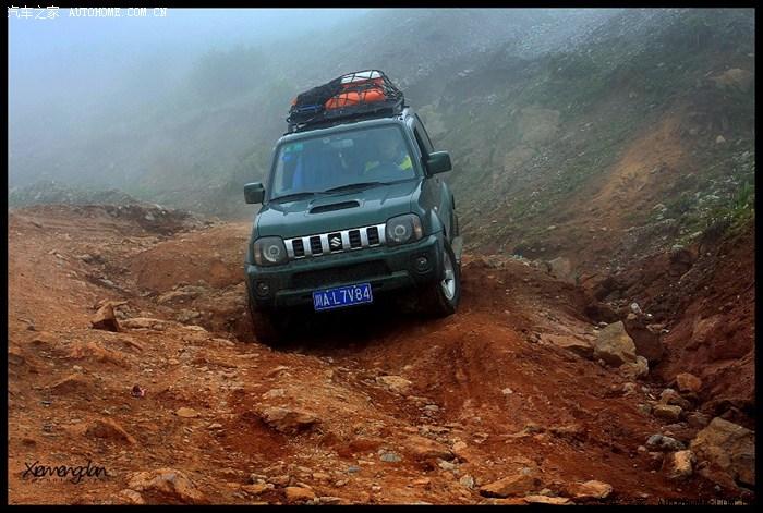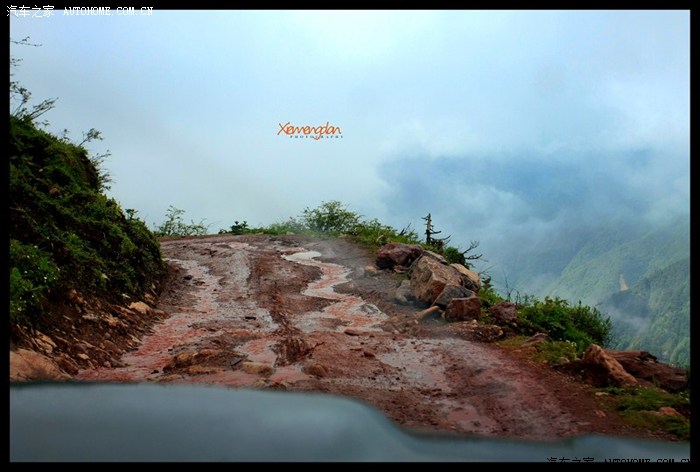 距山顶不到2km,路更糟糕,须切换低速4驱。多是小角度的急转弯,小jj在深坑和光滑的尖石上摸索,旁边就是悬崖峭壁,一些被雨水冲刷浸泡的边缘不敢去试探它的松软,那时我在担心,不知道车下淋得稀里哗啦的我和车上忐忑晃荡的伙伴们到底谁更幸运?因为稍不留神,我就得目送小jj裹挟着这两对男女滚下山去。