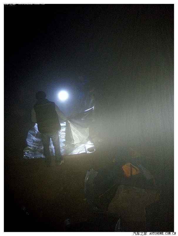接下来,我们犯了第二个错误:下着雨开始倒腾物资,扎营,本来压缩收纳好的物品倾泻在狭小的车厢,瞬间凌乱,导致后来根本无法从大雨中逃回车里,被迫硬着头皮在风雨里苦苦摸索着搭那8人大帐篷,本来它在我们心里多么惬意:两室一厅,甚至还有翘起的屋檐。但上山前偷了个小懒,没有预习搭建这复杂的装备,现在我们如洞房花烛夜,全凭摸索着下手,进展相当缓慢。反常的四月天,大风大雨,开始飘雪,老天爷?还能更惨点么?天边隐隐传来惊雷,那是老天爷果决的说,还能!于是,它又开始了豆大的冰雹,砸在身上,痛。。。。我的羽绒背心被浇灌成湿棉被,单薄的牛仔裤冰冰凉透心凉。就这样,我们在风雪交加冰雹夜里和帐篷苦苦纠斗1个多小时后不得不功败垂成,但座位上又堆满了物资,要回车上已经非常困难,绝望时,发现附近有守山人员的执勤点,狼狈逃窜过去,连裤管里都下着雨。这是晚上21:00。