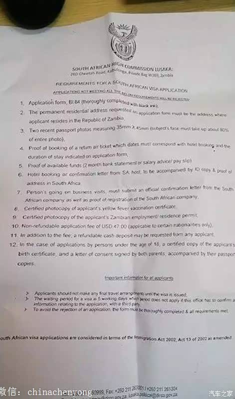 我也去了趟南非大使馆,大使馆拿了一份资料给我,上面写着需要当地居留证,这个就麻烦了,当时护照没有在身上,所以也没有多问。