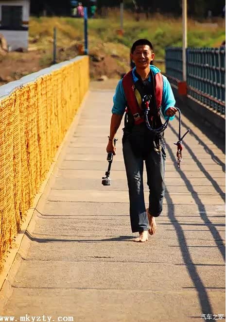 没有穿鞋,光脚走在铁桥上,还比较抵脚。