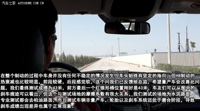 百公里制动就是从100km/h减至0公里,在紧急制动时H8车身姿态还算不错,不会出现有些SUV车型在制动时仿佛车身要离开底盘那样夸张的场景。并且在整个制动的过程中车身并没有任何不稳定的情况发生,车头始终有坚定的指向,但H8制动的热衰减也比较明显,前段较硬,后段感觉软,这个问我们已反馈给总监,希望量产车会改善此问题,我们最终测试成绩为43米,前方最后一个红锥形桶位置刚好是43米,车友们可以从图中的刹车痕迹可以看出,但这个与测试场地的摩擦系数有很大关系,我们测试的场地为水泥路面专业测试都会去柏油路面,而且测试车辆非量产车,轮胎以及刹车系统还处于磨合阶段,导致刹车成绩出现差异也属于正常现象。