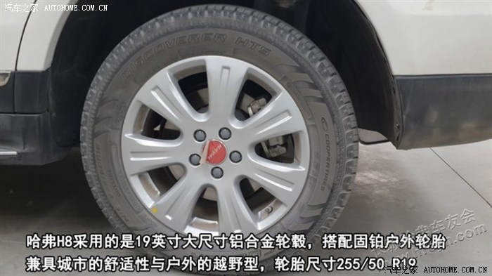 哈弗H8采用的是19英寸大尺寸铝合金轮毂,搭配固铂户外轮胎,兼具城市的舒适性与户外的越野型,轮胎尺寸255/50 R19,低配是配的18英寸的轮胎,H8的备胎是非全尺寸的,最初我认为这样配置很不厚道,然后与工作人员交谈得知,他们这样做是有原因的,这么大的胎如果备胎用全尺寸估计没两个人是抗不动的,女士开的话就更不用说了,另外考虑到全尺寸胎过于厚,又会占用后备箱至少5CM的高度,所以没有选择配置全尺寸备胎。