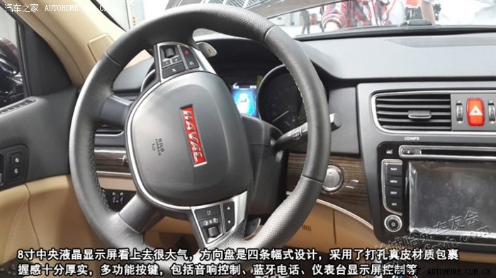 同哈弗H6一样,H8还是采用了炮筒式的仪表盘,运动风格显而易见,中间显示屏相比哈弗H6功能更多,仪表台中央的液晶显示屏看上去很大气,也能显示更多车辆行驶信息,方向盘是四条幅式设计,采用了打孔真皮材质包裹,握感十分厚实,多功能按键,包括音响控制、蓝牙电话、仪表台显示屏控制等。