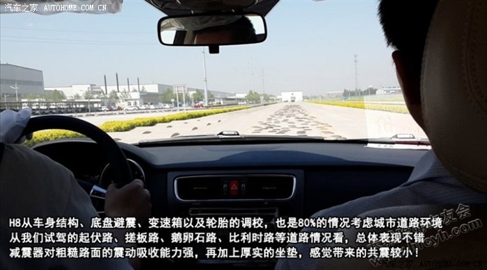 H8是城市SUV,会更偏重城市路面驾驶的舒适性,八成主要是在城市、高速公路行驶,二成在砂石、斜坡等非铺装路面行驶,因此H8从车身结构、底盘避震、变速箱以及轮胎的调校,也是80%的情况考虑城市道路环境,从我们试驾的起伏路、搓板路、鹅卵石路、比利时路等道路情况看,总体表现不错,减震器对粗糙路面的震动吸收能力强,再加上厚实的坐垫,感觉带来的共震较小!