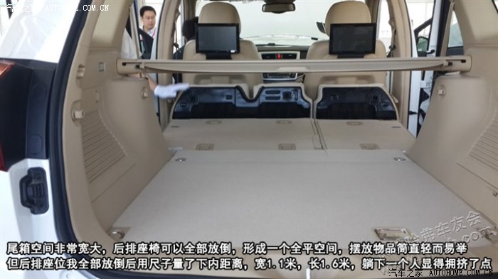 关于H8的尾箱空间非常宽大,后排座椅可以全部放倒,形成一个全平空间,摆放物品简直轻而易举,但后排座位我全部放倒后用尺子量了下内距离,宽1.1米,长1.6-1.7米(放头枕处占用的位置未测量),躺下一个人显得拥挤了点,想把H8当车床的车友得在后期改装上需要好好思考一番了。
