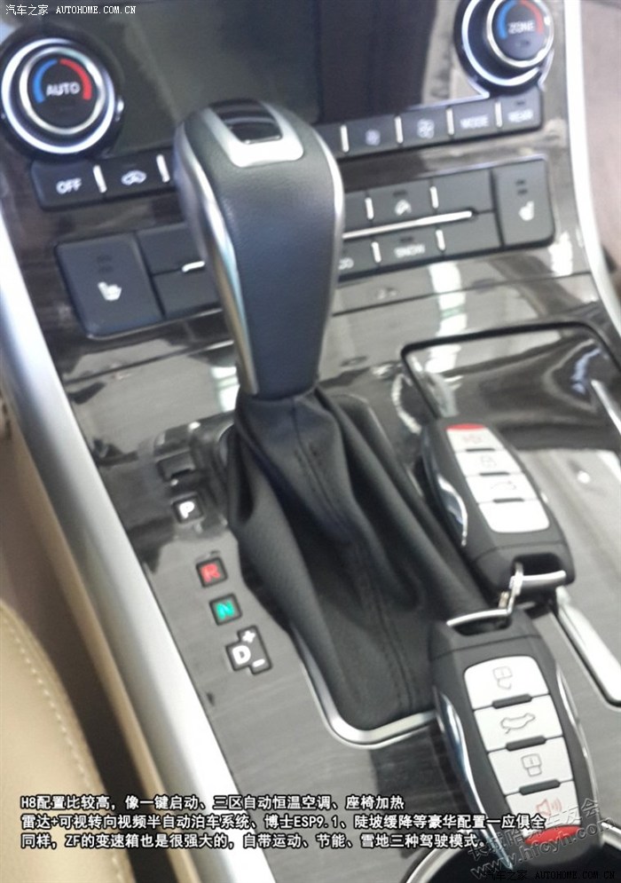 H8配置比较高,像一键启动、三区自动恒温空调、座椅加热、前后共八个雷达+可视转向视频半自动泊车系统、博士ESP9.1、陡坡缓降等豪华配置一应俱全,同样,ZF的变速箱也是很强大的,自带运动、节能、雪地三种驾驶模式。