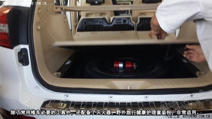 H8的工具箱还是比较全面,除了常用修车必要的工具外,还配备了灭火器,野外旅行健康护理套装包,非常适用。
