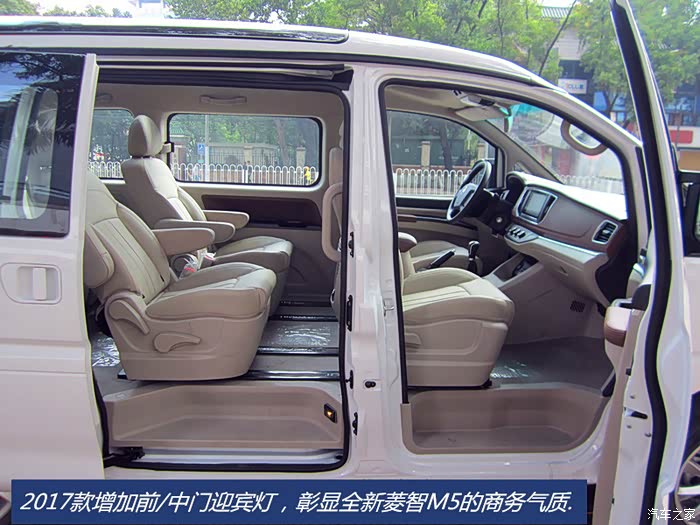 2017款菱智M5带给我们五大升级21项技术提升,【外观】搭载源自三菱高性能、低油耗、低排放的1.6L 4A92发动机的全新菱智M5依旧保留家族展翼式前格栅,沉稳大气的同时也增强辨识度,尤其在中网的设计采用倒梯形,四条格栅加以镀铬元素点缀,饱满格栅型面很好的凸显其精致与品质。【内饰】我们可以看到重新设计的豪华仪表台,从左侧驾驶室延伸至副驾驶位,一气呵成整体感强,与多媒体一体机的层次感布局相得益彰,档次提升的同时更显豪华大气。【娱乐多媒体】主流的8英寸触控大屏集成手机互联系统,蓝牙电话,SD&U盘读取,及行车电脑参数调节等一系列功能。在这一代菱智M5座椅中,中高配车型同样采用中部打孔的仿真皮质面料,触感舒适质感柔软,即使长途自驾其乘坐舒适性进一步提升。【NHV静音性能】2017款在NHV性能得到极大提升,增加DMF双质量飞轮和TVD扭转减震器衰减传动系统振动等共计40处降噪处理,降噪水平已超越同级别车型。【工艺水平】在整车工艺细节处全新菱智M5采用风口热烫印工艺,其原理利用专用的金属烫印版通过加热、加压的方式将烫印箔转移到承印材料表面,其特点具有精度高、表面光泽度亮,立体层次感强,很好凸显内饰档次的视觉效果。除此之外2017款更首次运用风口二次注塑技术,利用两种不同材质或颜色注成一体,其优点除了美观精致外,其结构耐久性更加稳定。