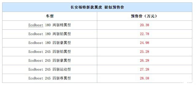 日前,我们从相关渠道获悉了长安福特新款翼虎的预售价格,新车共会推出7款车型,其疑似预售价为20.38-28.58万元。此外,新款翼虎针对部分配置车型还推出了包括氙气大灯和19英寸轮圈在内的选装包。