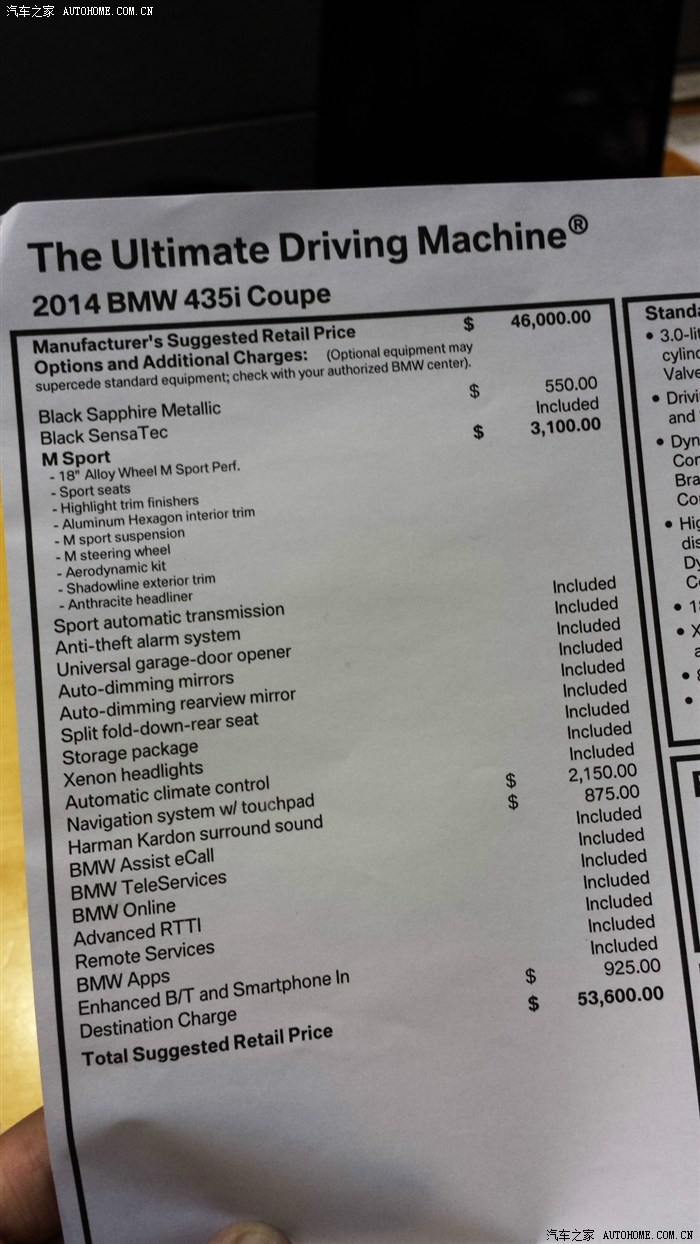 PS: 328駕駛體驗還是不錯的,對於日常使用絕對足夠,動力也有,但相對435來說,加速油門的平順和引擎的聲音的確会產生差距,當我駕駛完328之後馬上換乘335.手感和腳感立馬感覺出來區別,因為是分期付款供的,差價是每個月多付100美元左右,所以最後還是決定要435了,漫長的兩個月等待開始了。。。