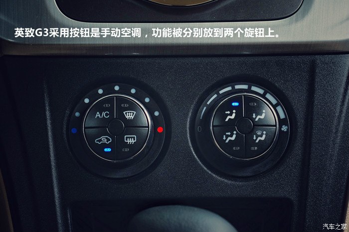英致G3采用按钮是手动空调,功能被分别放到两个旋钮上。
