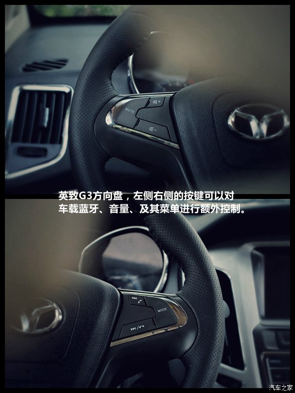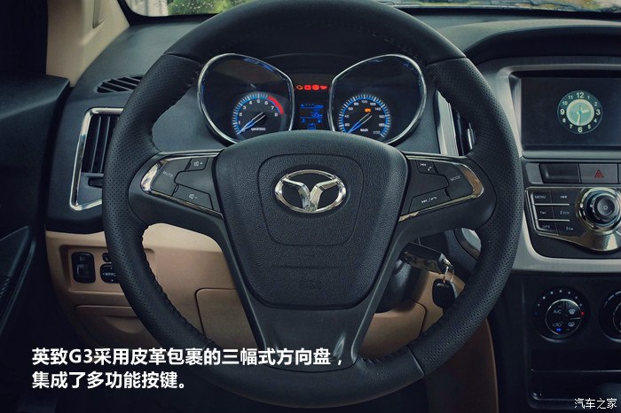英致G3采用皮革包裹的三幅式方向盘,集成了多功能按键。