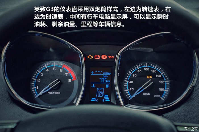 英致G3的仪表盘采用双炮筒样式,左边为转速表,右边为时速表,中间有行车电脑显示屏,可以显示瞬时油耗、剩余油量、里程等车辆信息。