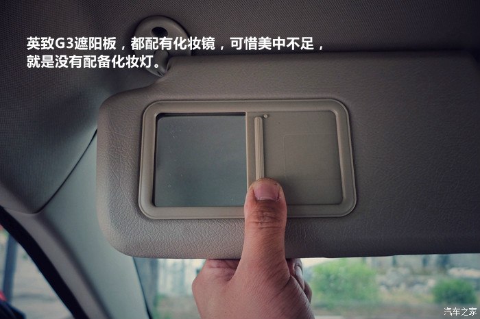 英致G3遮阳板,都配有化妆镜,可惜美中不足,就是没有配备化妆灯。