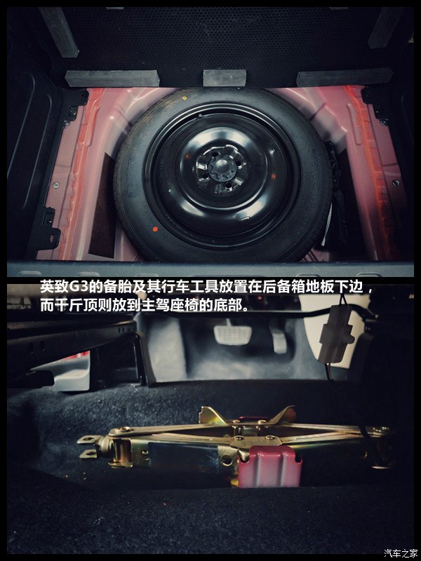 英致G3的备胎及其行车工具放置在后备箱地板下边,而千斤顶则放到主驾座椅的底部。