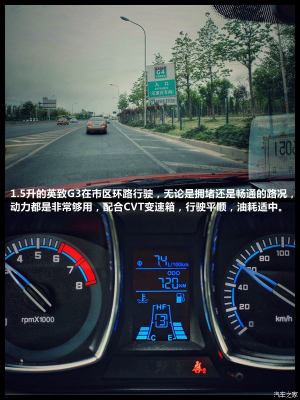1.5升的英致G3在市区环路行驶,无论是拥堵还是畅通的路况,动力都是非常够用,配合CVT变速箱,行驶平顺,油耗适中。