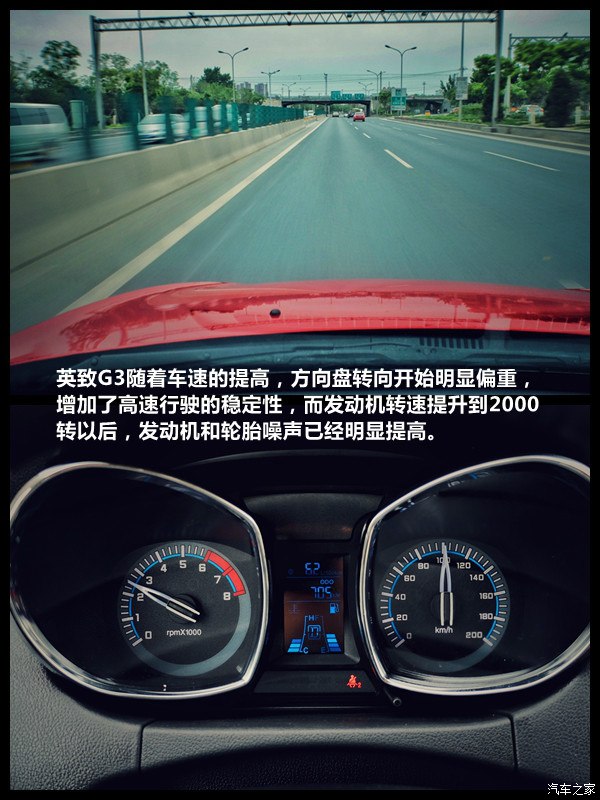 英致G3随着车速的提高,方向盘转向开始明显偏重,增加了高速行驶的稳定性,而发动机转速提升到2000转以后,发动机和轮胎噪声已经明显提高。