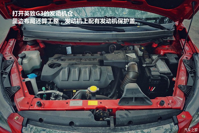打开英致G3的发动机仓,里边布局还算工整,发动机上配有发动机保护盖。