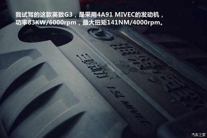 我试驾的这款英致G3,是采用4A91 MIVEC的发动机,功率83KW/6000rpm,最大扭矩141NM/4000rpm。