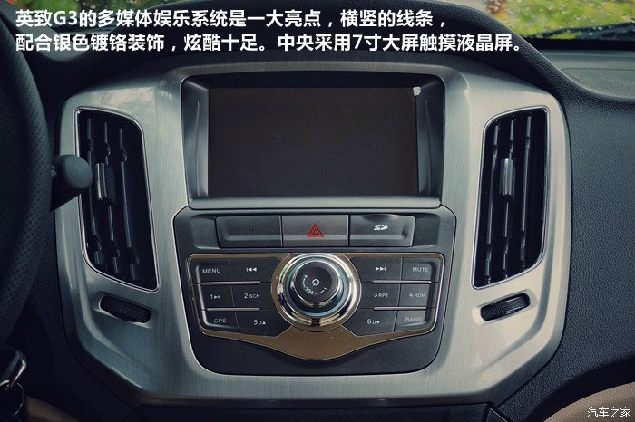 英致G3的多媒体娱乐系统是一大亮点,横竖的线条,配合银色镀铬装饰,炫酷十足。中央采用7寸大屏触摸液晶屏。