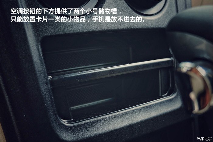 空调按钮的下方提供了两个小号储物槽,只能放置卡片一类的小物品,手机是放不进去的。