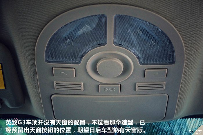 英致G3车顶并没有天窗的配置,不过看那个造型,已经预留出天窗按钮的位置,期望日后车型能有天窗版。