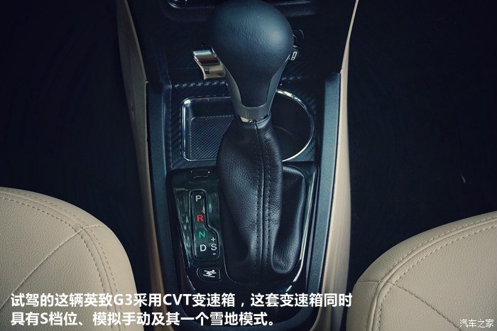 试驾的这辆英致G3采用CVT变速箱,这套变速箱同时具有S档位、模拟手动及其一个雪地模式。