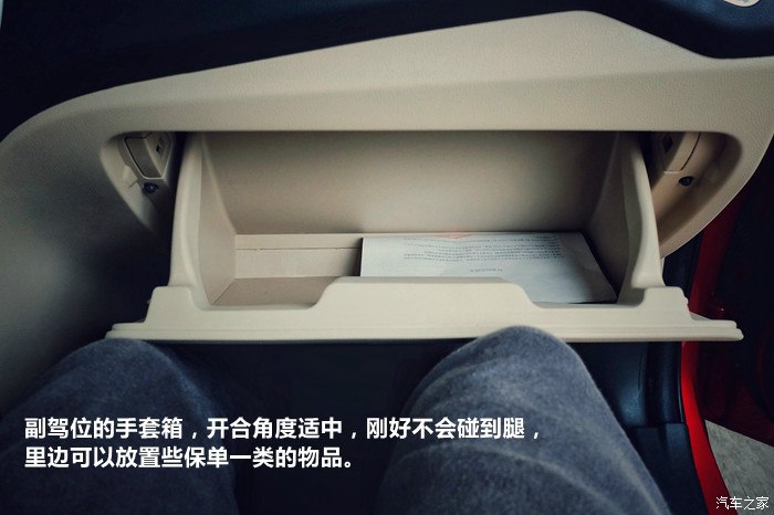 副驾位的手套箱,开合角度适中,刚好不会碰到腿,里边可以放置些保单一类的物品。