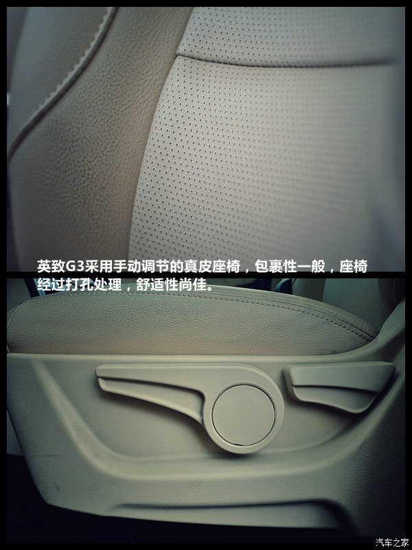 英致G3采用手动调节的真皮座椅,包裹性一般,座椅经过打孔处理,舒适性尚佳。
