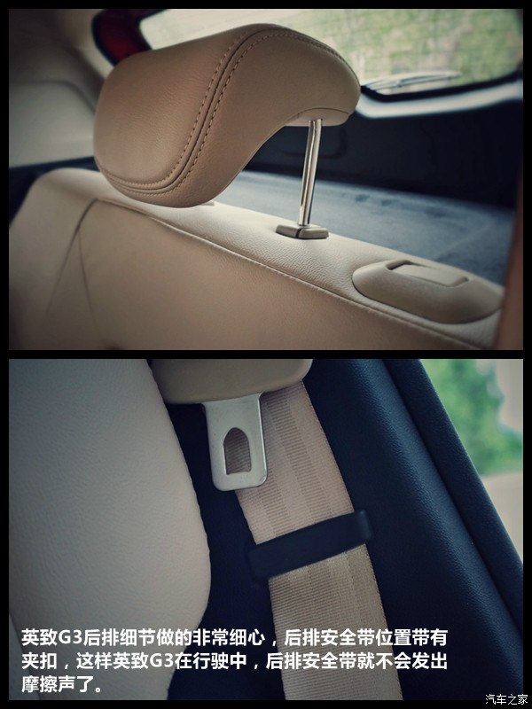 英致G3后排细节做的非常细心,后排安全带位置带有夹扣,这样英致G3在行驶中,后排安全带就不会发出摩擦声了。