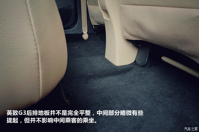 英致G3后排地板并不是完全平整,中间部分略微有些拢起,但并不影响中间乘客的乘坐。