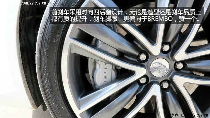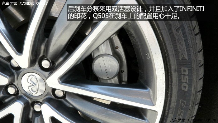 刹车方面Q50前轮采用对向大四活塞,后轮采用对向单活塞刹车,全力刹车时ABS介入明显,配合245的轮胎,刹车力度非常大,很快可以将车速降下来,整体感觉比较偏向于BREMBO的脚感,喜欢改装车的朋友在这方面可以省钱了,原厂的这套刹车系统非常好用,完全可以胜任Q50S的强大动力。日常使用初段脚感会有些软,这也和日系车的调教有关,适应一下就没问题了。