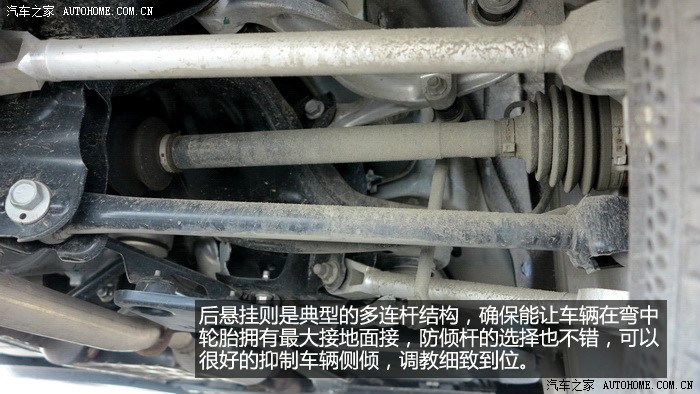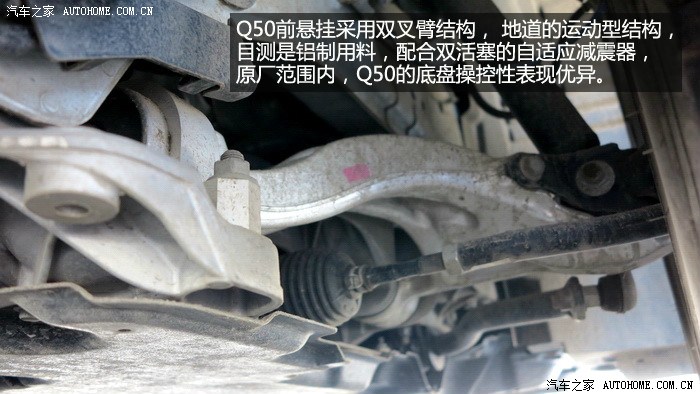 底盘方面值得聊一聊,Q50采用了前双叉臂,后多连杆形式的悬挂系统,这套结构物理上来说就是非常偏向于运动的,能使车辆在转向中让车轮最大面积接触地面,并且能够给驾驶者更短对车辆的掌控,再配合Q50装备的双活塞自适应避震,并且是机簧一体式设计,提高避震反应能力,激烈驾驶的时候悬挂对车身的支撑还是比较到位的,没有多余的弹跳,作为后驱车型,弯道的车身循迹性也是不错滴。唯一的遗憾就是缺少了后桥差速器,如果能加上不管是在操控性还是可玩性上都能在提高一些。避震方面虽然是双活塞的自适应减震器,但是日常乘坐时还是会感觉比较硬一些,舒适性有所降低,究其原因一个是19寸轮毂配合245 40的缺气保用轮胎,另一个是阻尼调校比较运动的避震,保证操控的同时适当牺牲舒适性也是在所难免的,总体来说,Q50的底盘调教对比G37更加运动硬朗,舒适性上有所妥协。这在如今市场换代产品中是非常少见的。转向方面,DAS线控主动转向系统的应用可以说是革命性的改变,由ECU控制的转向在激烈操控中表现优异,反应很迅速,没有延迟,方向盘上的动作都会同步到车身上,一个反应迅速且精准的转向对Q50的操控大大的加分。可能有些人会质疑这样的方向会不会太贼,实际驾驶后发现并不会,ECU通过车速适时调整转向比和阻尼,驾驶起来很轻松。日常驾驶也会受益颇多,低速掉头或者泊车,一圈多一点就能将方向最大化,并且配合车道保持系统,车辆可以轻松行驶在车道中央,不需要驾驶者经常调整方向。