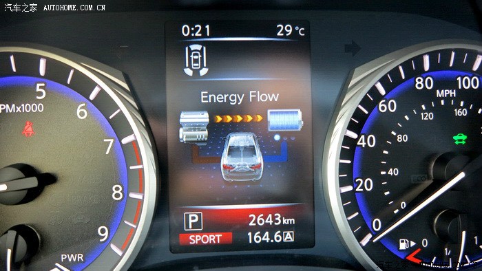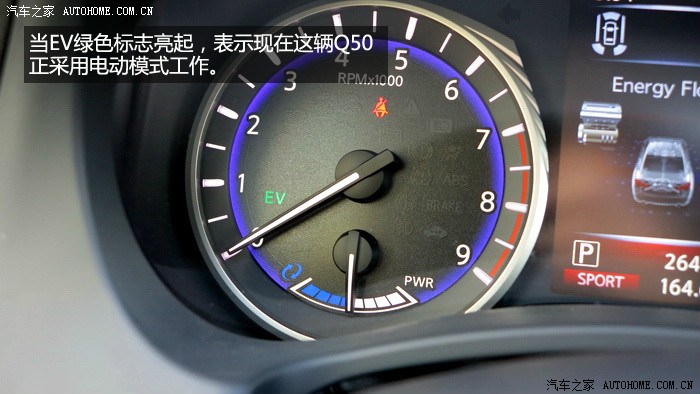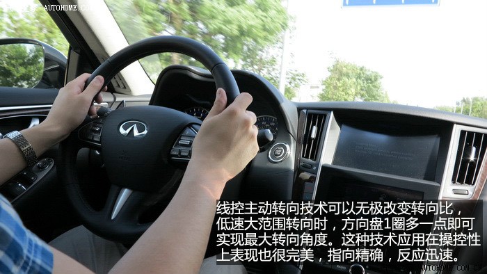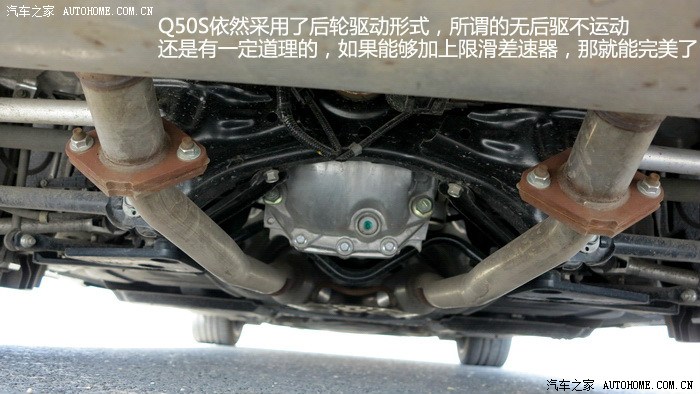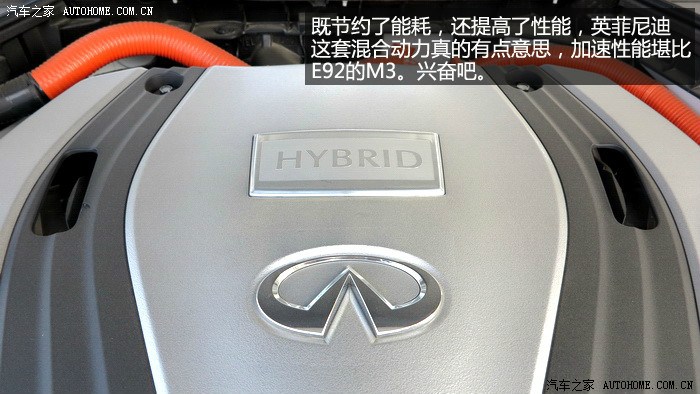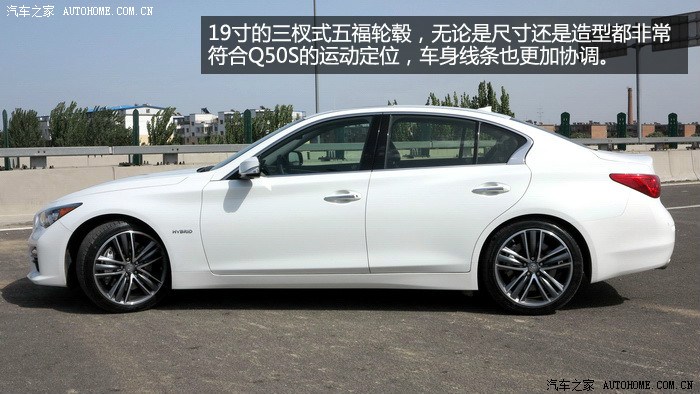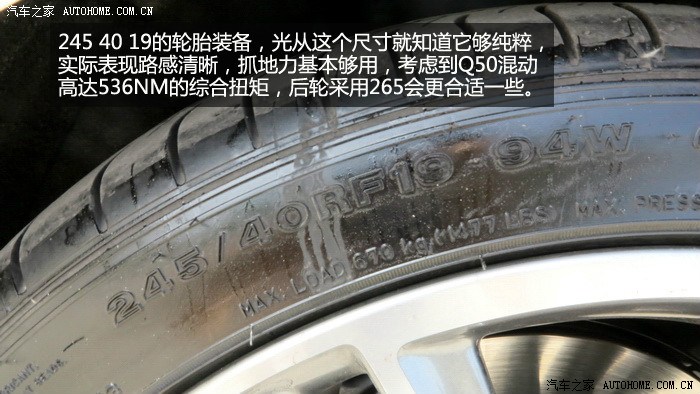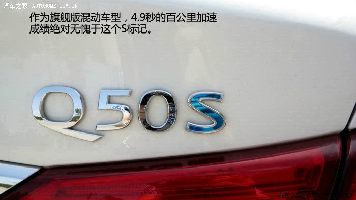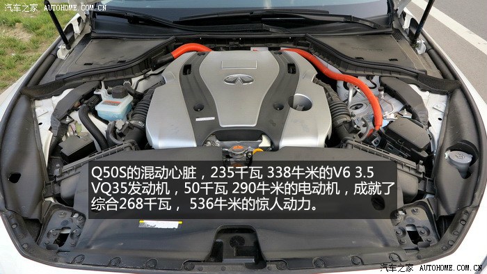 。Q50S搭载的VQ35发动机玩车的朋友们一定不会陌生,日产的拳头产品,多年的十佳发动机,确实也没有让人失望,启动后抖动非常轻微,V6的特性表现得淋漓尽致,SPORT模式下,全油门转速上升的很快,声音非常悦耳,整个加速过程非常线性,最近一直开涡轮增压车的我,重新体验了这种顺畅猛烈的加速感,很激动。Q50S的电机部分全程可以参与到加速过程中,对于电机的加速特性,完全冲抵了自然吸气高转速发力的弱点,它们的结合让Q50S在1470转的时候就拥有了536NM的强大扭矩,0-100公里加速全油门起步,245的后轮会有轻微打滑,如果能拥有更宽一些的轮胎,我相信加速可以更迅猛。整段加速都非常顺畅,没有用专业的仪器测试,但是从经验和感官上来说,官方的4.9秒百公里加速是完全没问题的。值得一提的是,运用手动模式或者换挡拨片,这台3.5升的V6发动机可以将换挡推迟到7100转,并且不会强制升档,高转速自然吸气发动机的优势充分发挥出来,这才是本质的运动,也是对自身发动机的信心表现。80-160公里加速也是可圈可点,丝毫不会感觉到动力衰减,大排量发动机配合电机共同驱动车辆对于Q50S的动力提升相当明显,日常驾驶中,电池在拥有3分之2电力时可以单独驱动车辆起步加速,松开油门滑行或者踩刹车,发动机介入时都会为电池充电,低速发动机介入时会有轻微震动,总体来说还是可以平顺的完成发动机和电机之间配合工作。