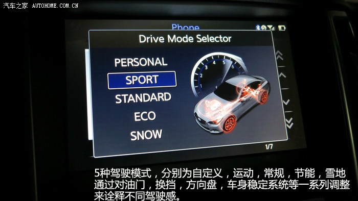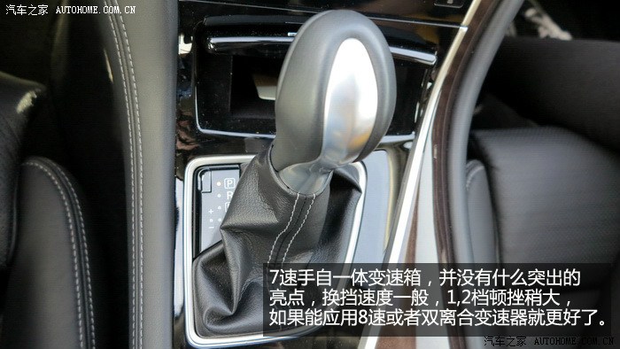 传动方面则没有动力方面表现的那样突出,Q50S选用了7速手自一体变速器,应该和之前的G37没有本质区别,换挡速度一般,无论是在哪个模式下,sport模式会有所改善,但也没有到双离合或者ZF8速那种干脆利落的感觉。1,2档换挡会有比较明显的顿挫,冷车时尤为明显,没有运动档,只有普通D档和手动模式,如果变数箱方面能够得到更进一步的升级优化,我相信Q50S的性能还能上一个台阶。