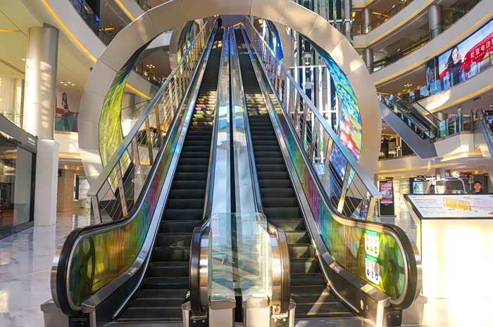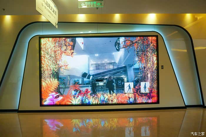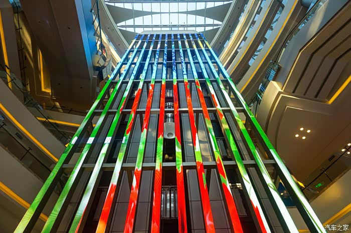 电梯墙上的LED屏和穿梭的电梯相映成辉