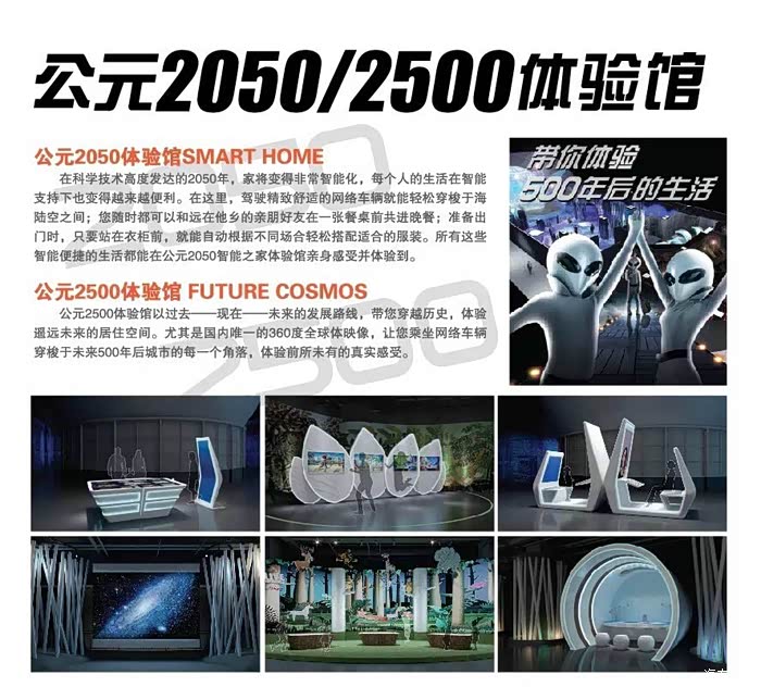 由日本爱知世博会原班人马跨国营建、由红星美凯龙投资,总耗资近3亿人民币的“公元2050年体验馆”和“公元2500年体验馆”,利用目前世界上一流的电子技术,以及最新的声、光、影像技术,将50年和500年以后人类的生活逼真地展现在人们的面前。