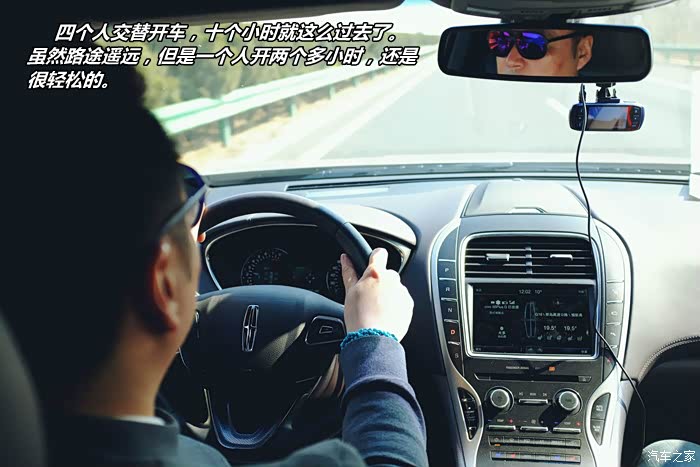 我们四个人对林肯MKX在高速上的表现很吃惊,毕竟车重2123kg,但车辆平稳,得益于厚重的底盘调教和CCD连续可调阻尼悬挂系统。动力充沛,得益于2.7T双涡轮增压发动机源源不动的动力输出。另外虽然车长4844mm,但是车宽却是1936mm 所以有了很好的稳定性。