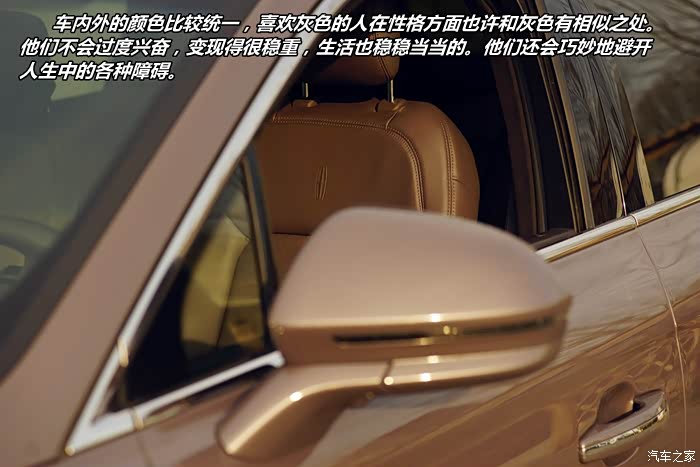 这辆林肯MKX总统版,车漆颜色是魅影灰,但是由于光照的缘故,有时是灰色有时又呈现出棕色或深灰色。不仅车辆外观是灰色的,内饰也都是运用灰色系的材料来进行装饰的。整体内外颜色还是很协调的,内饰颜色由浅及深,并没有给人以唐突和压抑的感觉。