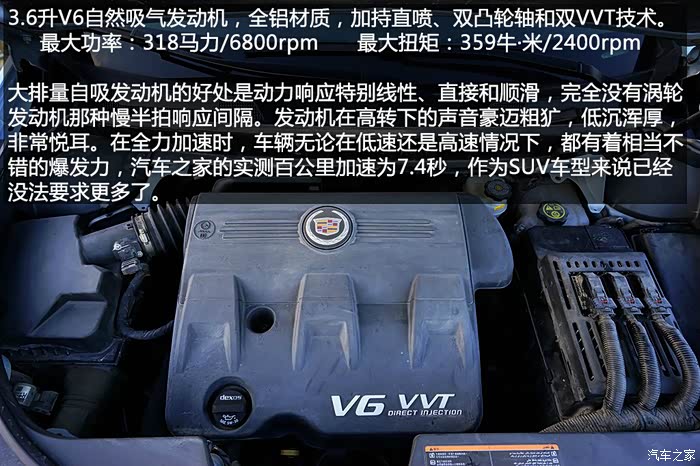 另外3.6升V6的发动机的嗓音属于典型的“美音”,豪迈粗犷,低沉浑厚,非常悦耳。不过SRX应该是出于车型定位的原因刻意抑制了发动机的部分声音,即使将转速拉高,传到驾驶舱的引擎声音已经比较低调了,也许这符合大部分用户的使用习惯,只是对我个人来说感觉有些不够过瘾。