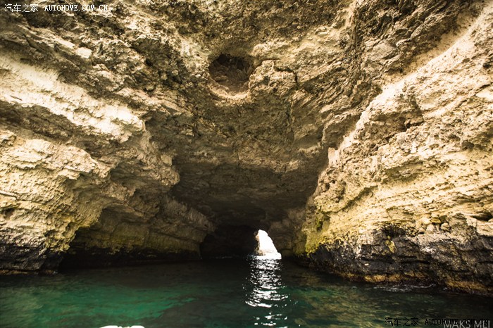 开着汽艇穿过这个岩洞,洞顶上还有个小洞,好像我们正在恐龙的屁股下面溜进去一样,这一定是巨型恐龙屁股的化石