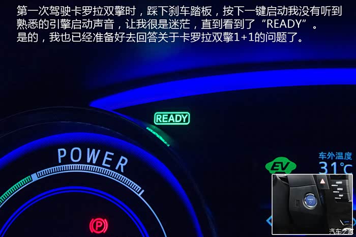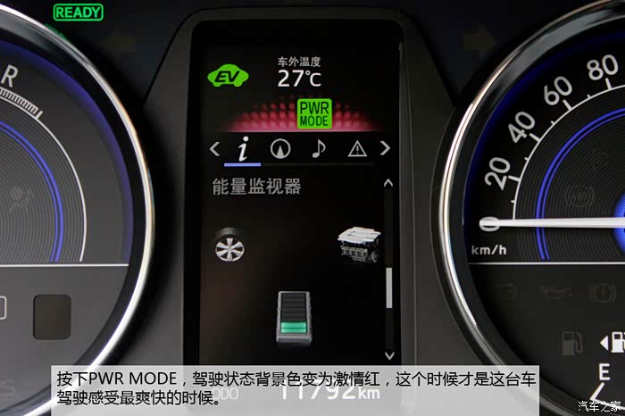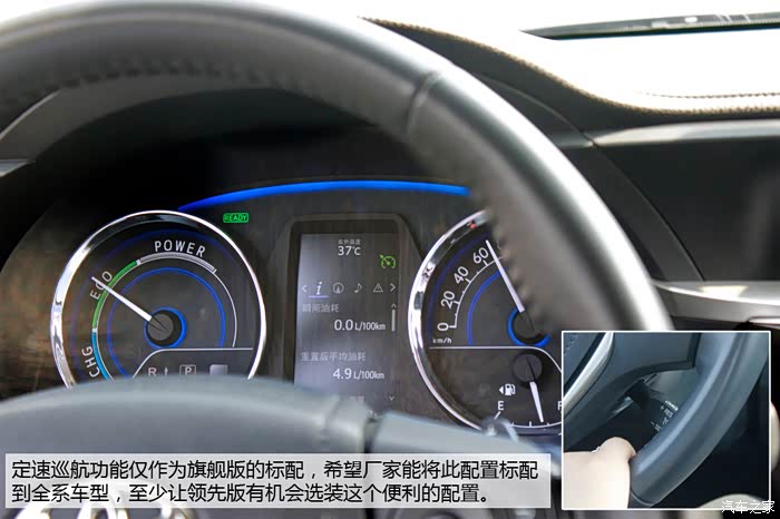 当第一次坐进车内,按照一般启动车辆的流程,踩住刹车踏板,按下一键启动时,我懵了—怎么没动静?反复试了多次,外甥打灯笼——照舅(旧),随后叫来工作人员指点才明白,只要电池组有电,就不会启动发动机。看见仪表盘上的Ready了吗?出现这个标识便说明车辆已经可以行驶了。