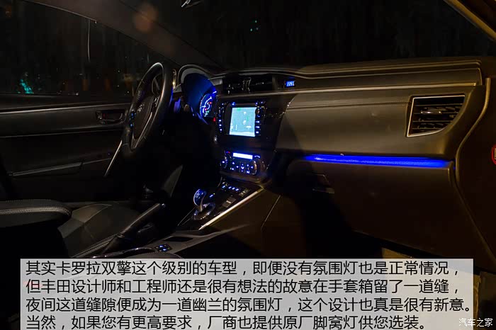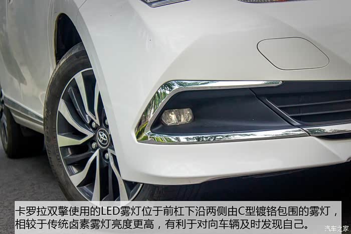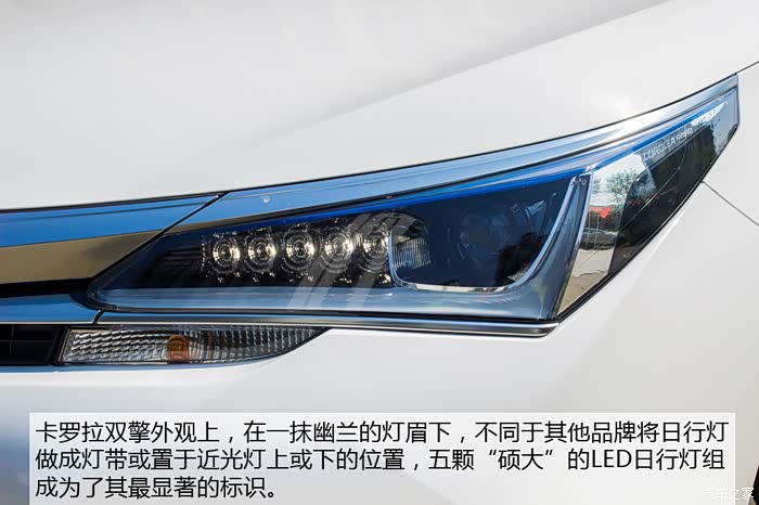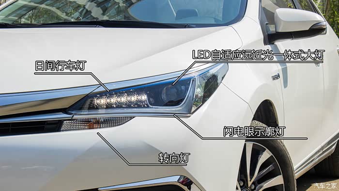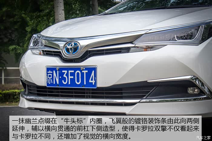 我相信,每一个买了卡罗拉双擎的人都不喜欢自己的车被认为是卡罗拉,或其他车型。关于辨识度的问题,丰田的设计师早就为我们考虑充分。从车头方向看过去,首先就是双擎车型独有的标识,融入深蓝基调,突显科技感,然后是卡罗拉双擎独有造型的LED灯组,不仅外型醒目而且带有自动水平调节的功能。其次就是向两侧延伸的亚光镀铬装饰格栅,最后便是层次分明的前杠。