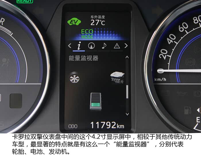 北京的堵车也不是全程堵死,每次都是拥堵一段,然后缓行一段,再畅通一段。拥堵时,驾驶混动车辆,最怕动能回收介入感明显,每一次的刹车或滑行卡罗拉双擎的动能回收都让你感觉不到它的介入,与此同时能量转移到电池组中存储;每一次行驶在畅通路段,只要将油门踩深点儿,使指针通过仪表盘上ECO中点,便会悄无声息的唤醒引擎,引擎一边负责向车轮输出动力,另一边给电池充电。