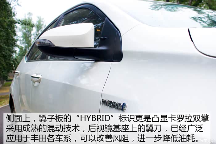 来到卡罗拉双擎的侧面,位于翼子板上的Hybrid的标识更是直接亮明身份和态度,“我是混合动力车型,我愿为减少二氧化碳排放贡献自己力量“。