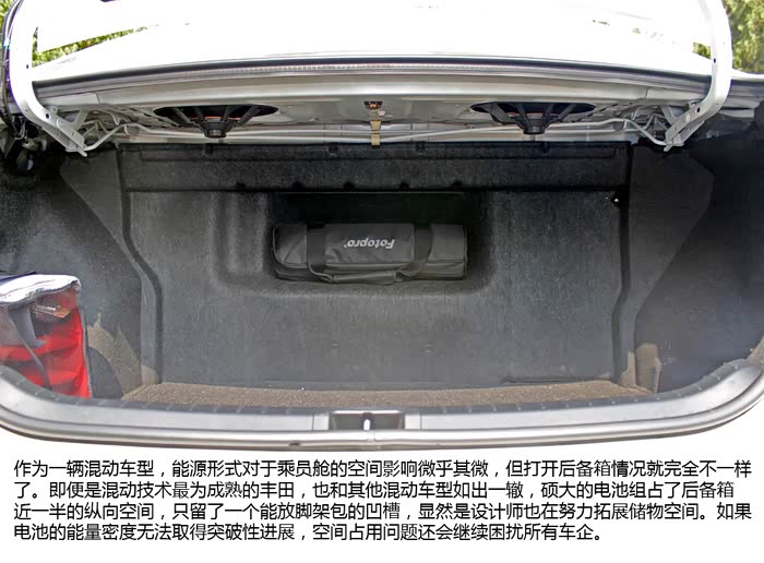 ∵ 卡罗拉双擎乘员舱内部空间利用充分,符合该级别车型日常用车需求,但后备箱的电池组却是实打实的占了不小的空间,而且导致后排座椅无法放倒,使得后备箱空间无法进一步拓展。