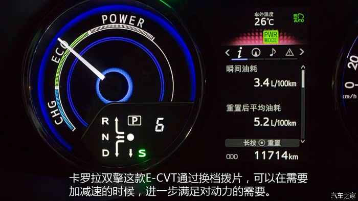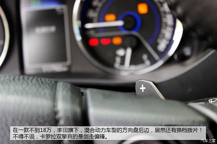 换挡拨片出现在这么一辆配备E-CVT的车型上,多少有点儿让人猝不及防,拨动变速箱档把到S档,居然发现卡罗拉双擎的转速输出可以完全交由驾驶员掌控,只要不拨动升档拨片,它可以一直维持在较高转速而不自作主张的升档。以至于巡航滑行的时候,当遇到需要急加速的时候,我会下意识通过拨片降挡,拉高转速增加动力输出,就像在开一台AT或DCT变速箱那样;而当遇到需要减速的时候,多亏卡罗拉双擎的踏板不是那种”日系贼“,降挡的同时缓收油门,再轻轻踩下制动踏板,利用发动机余下的惯性给电池组充充电。