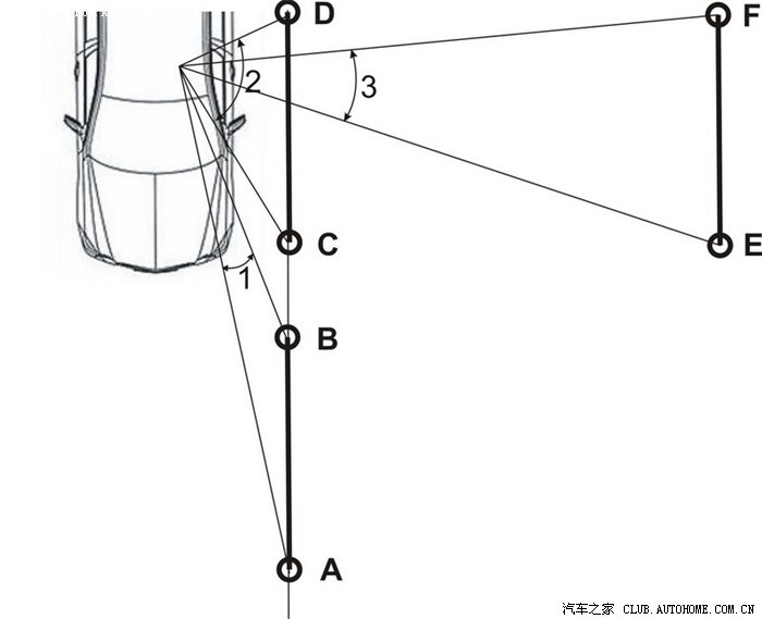 A-B=C-D,但∠1显然比∠2小得多,所以通过前窗看与通过侧窗看同一景物速度感是完全不同的;同样通过侧窗看远处的景物速度感也会变慢,如图E-F=C-D,但∠3显然也小于∠2。