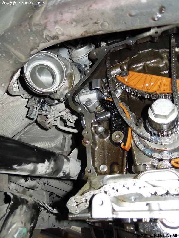 前一天预约,但一早到店,预约技师临时上午请假直到中午才到。该工作组实习生在其它组师傅和技工的帮助,折腾半天两个壳都没能拆下。郁闷的不光是我,还有那个小实习生,自嘲来打酱油的!下午磕磕绊绊,整耗时12小时总算在技师的摸索中完成各项工作,尤其可乐的是,晚上装配竟然吸引了5-6个技师来帮忙,场面甚是壮观,尤其装发动机支架那是轮流上阵各显神通,看的也是一阵热血!过程不多赘述,后有简单图片介绍。最关键的是在过程中跟多位技师及技术主管沟通中多少了解到:店里已接触4-5起顶缸事件,他们认为涨紧器多少起了点问题,能换掉最好,但也不是绝对的。建议注意油品质量和燃油添加剂定期使用。