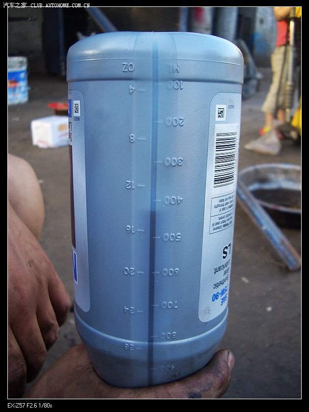 为了避免被齿轮油加注器残留的矿物齿轮油污染,本次换油采取了“打吊瓶”的方式进行:老板买来一根1米长的塑料管,将齿轮油带尖的瓶盖上端剪开,覆膜四下后剪开中间部分再贴回去,将瓶盖尖端插入塑料管,再将瓶盖拧紧,塑料管下端深入注油口内。修车店老板和伙计一致反应这款齿轮油是他们所见过的最稀的一款。当然了,齿轮油的气味儿都不好闻,这一款更是尤其的臭